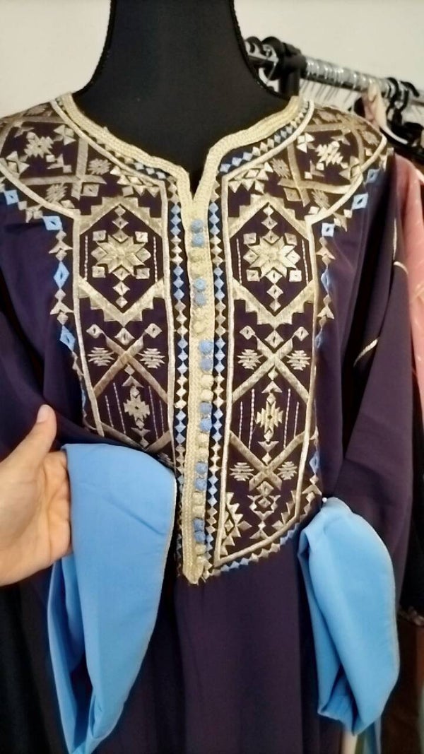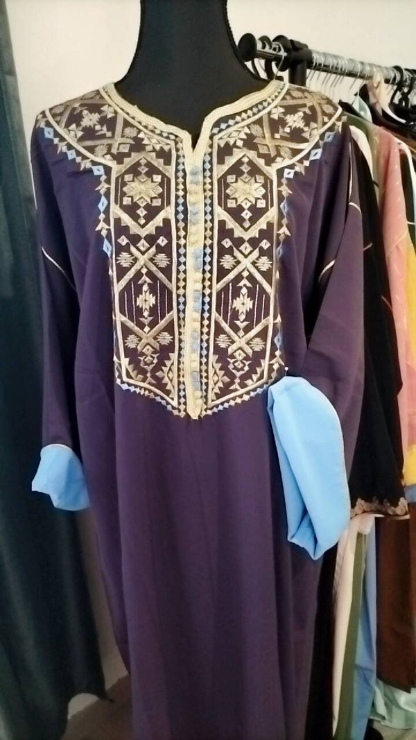Gandoura en crepe violet foncé manches double couleur bleu mesure de aisselles à aisselles bat-bat 65 cm idéal pour les tailles L, xl et xxl